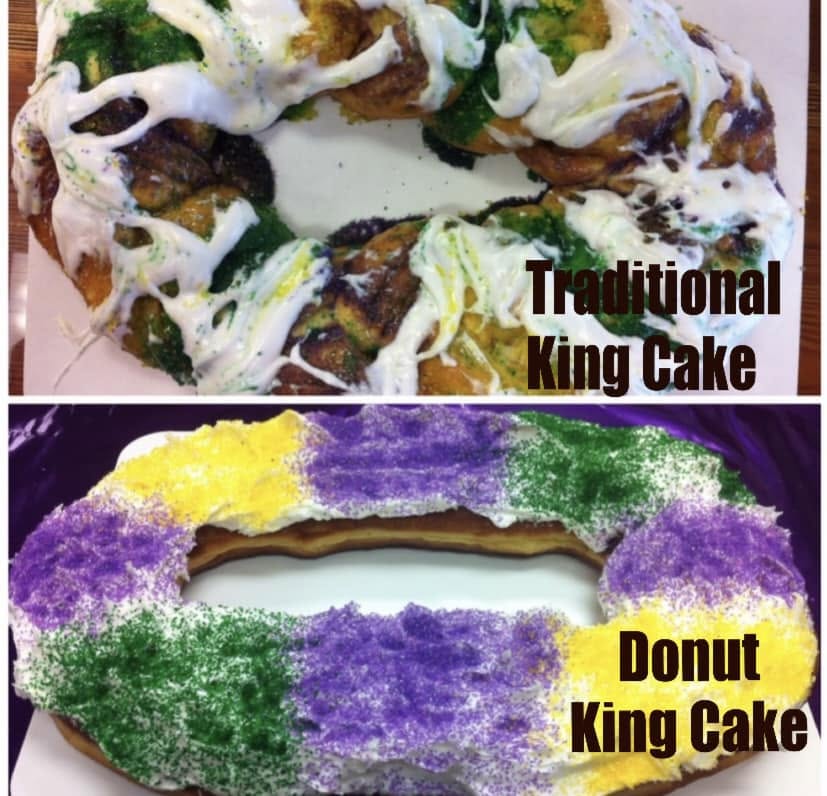 Traditional Baked King Cake – A classic Louisiana favorite! Made with soft, braided dough swirled with cinnamon, baked to perfection, and filled with your choice of delicious icing.